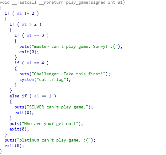 또한 play_game 함수에서 system("cat ./flag"); 함수를 발견할 수 있다.