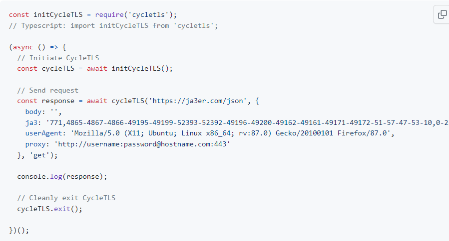 // Typescript: import initCycleTLS from 'cycletls';