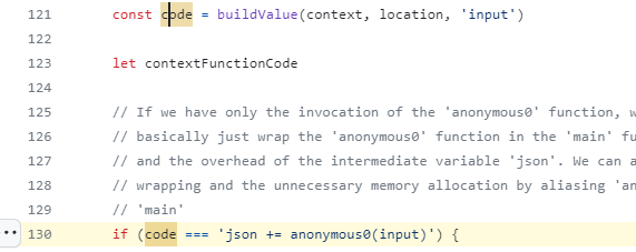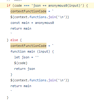 After comparing the "code" variable to the ' json + anonymous0(input) ' value, it defines a contextFunctionCode and subsequently execute this code. The point is it executes contextFunc.