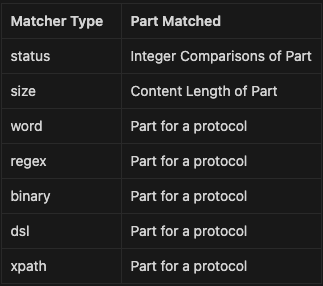 Matchers를 통해 다양한 Protocol Response 유형을 유연하게 탐지할 수 있다. 기본적으로 지원하는 Matcher는 다음과 같다.