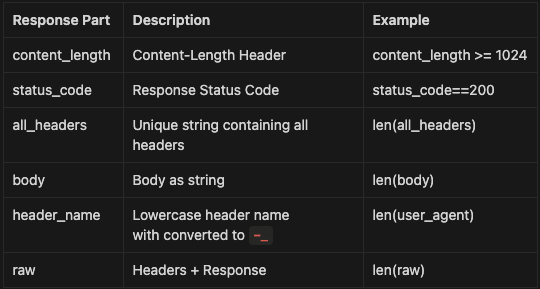 - "len(body)<1024 && status_code==200" # Body Length가 1024 미만이고 status_code가 200인 경우만 체크